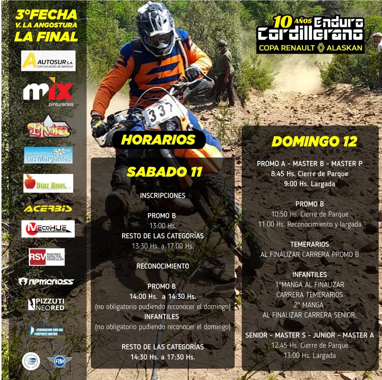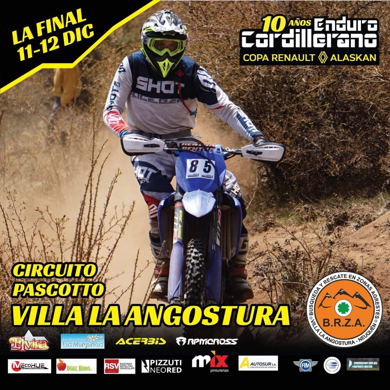 Este fin de semana se vuelve a correr en el circuito de Pascotto la final del Enduro Cordillerano, campeonato que empezó en Villa la Angostura hace 10 años reuniendo a todos los pilotos de enduro del Valle y la cordillera. A esta instancia final del campeonato hay varios pilotos de Villa la Angostura que pelean por tener el lugar más alto del podio. Desde la organización explicaron que "todo lo recaudado será para el grupo de Búsqueda y Rescate en Zonas Agrestes de Villa la Angostura, el cual nos ha ayudado en todo para hacer posible esto. Habrá un patio de comidas y se espera pilotos de toda la patagonia para que vengan a correr en nuestro pueblo".