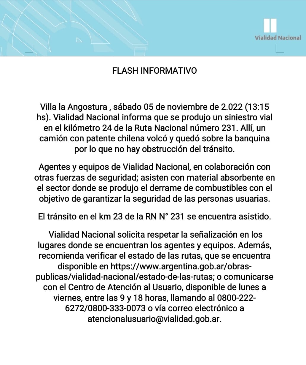 Vialidad Nacional informa que se produjo un siniestro vial en el kilómetro 24 de la Ruta Nacional número 231.