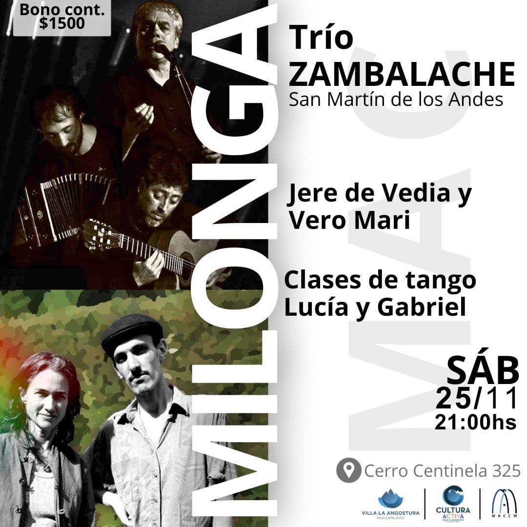 Este Sábado 25/11 en el MAC te invitamos a la MILONGA con música en vivo de la mano del trío ZAMBALACHE de San Martin de los Andes, con la presentación de Jere de Vedia y Vero Marí y clases de tango con Lucia y Gabriel