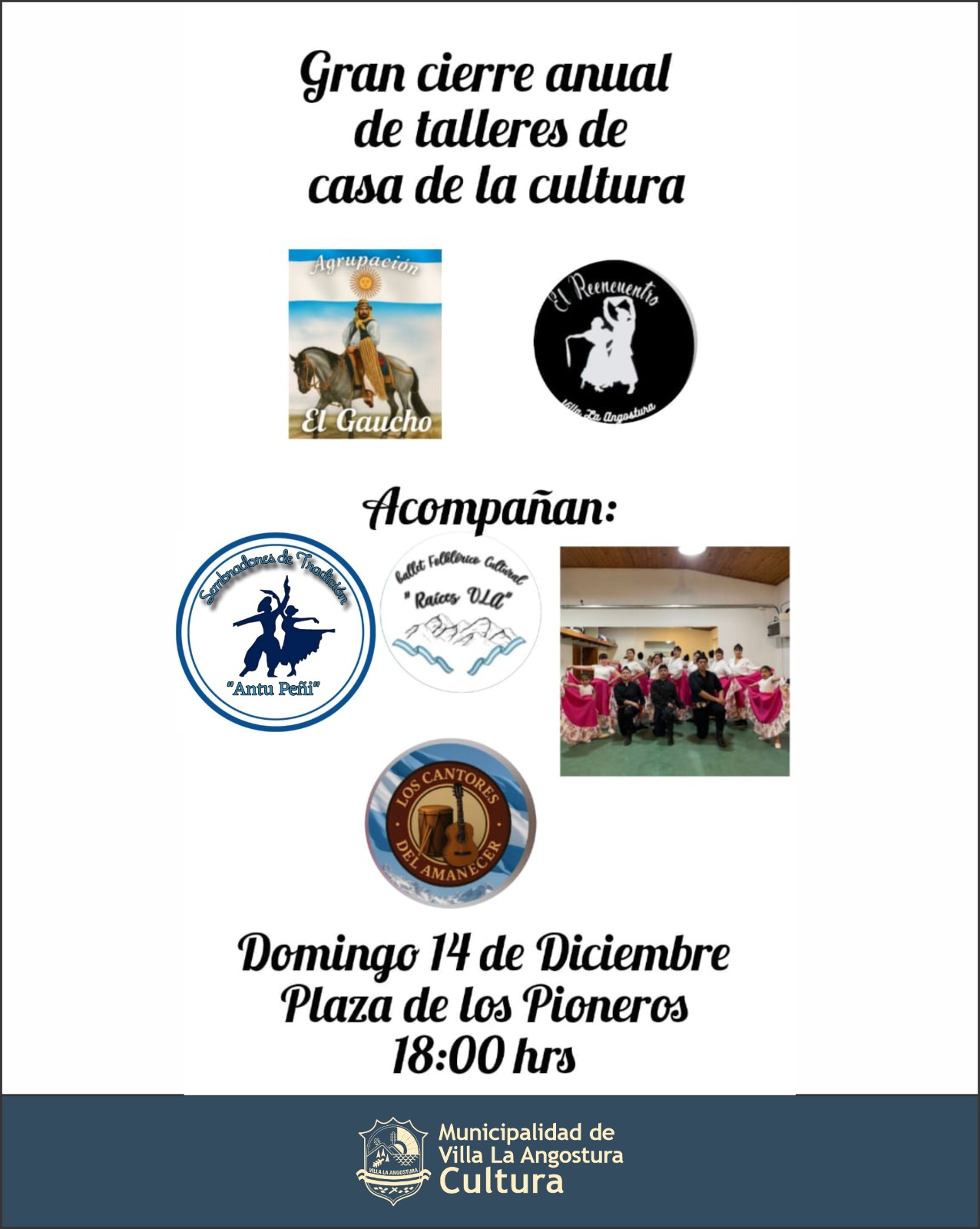 La Municipalidad de Villa La Angostura, a través de la Secretaría de Cultura, invita a la comunidad al Gran Cierre Anual de los Talleres de la Casa de la Cultura, que se llevará a cabo el domingo 14 de diciembre en la Plaza de los Pioneros, desde las 18 horas.