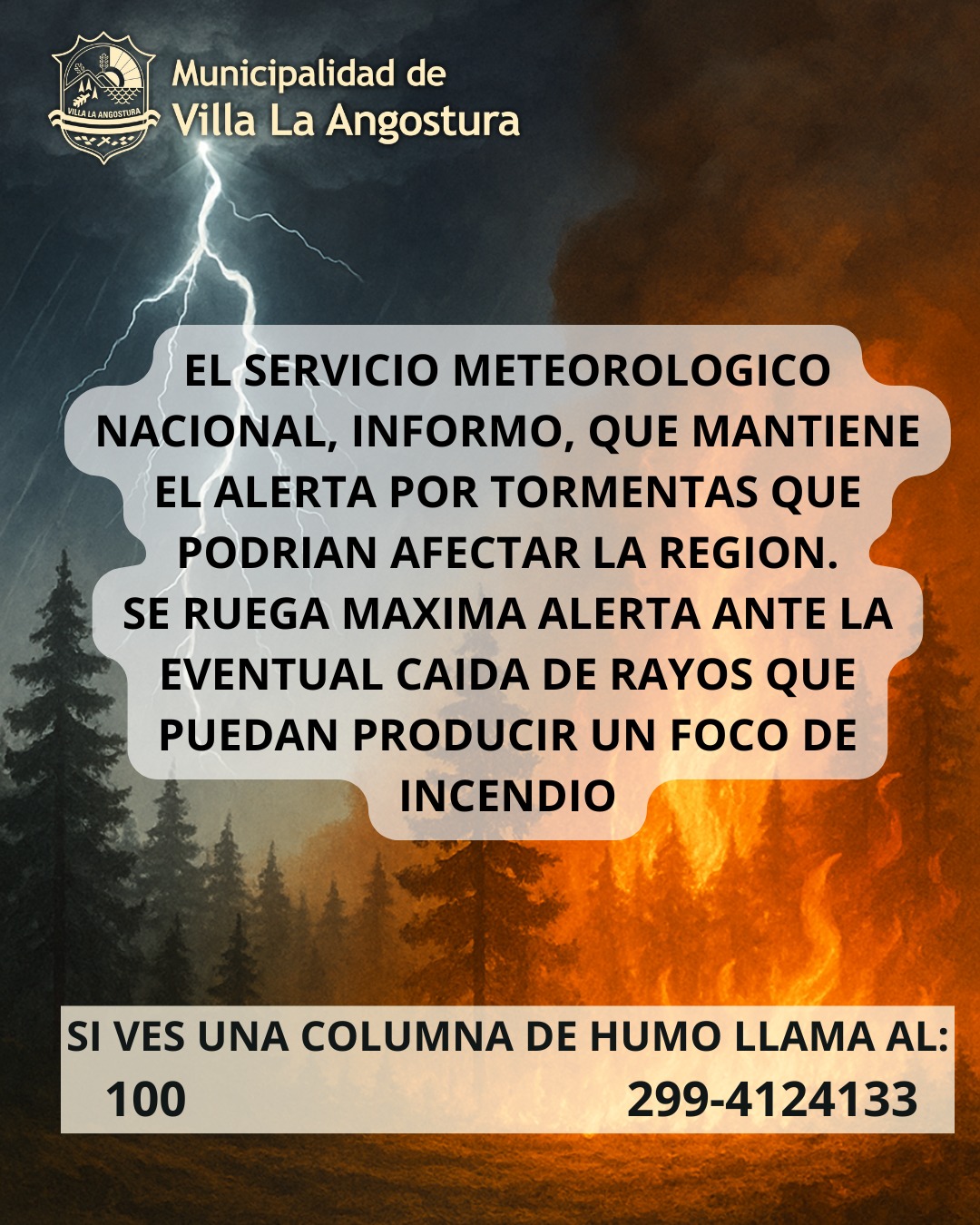 La Secretaría de Seguridad y Ordenamiento Vial informa que se mantiene el alerta por tormentas en la región.Se solicita extremar precauciones ante la posible caída de rayos que puedan generar focos de incendio.Si ves una columna de humo, llamá al 100 o al 299-4124133.