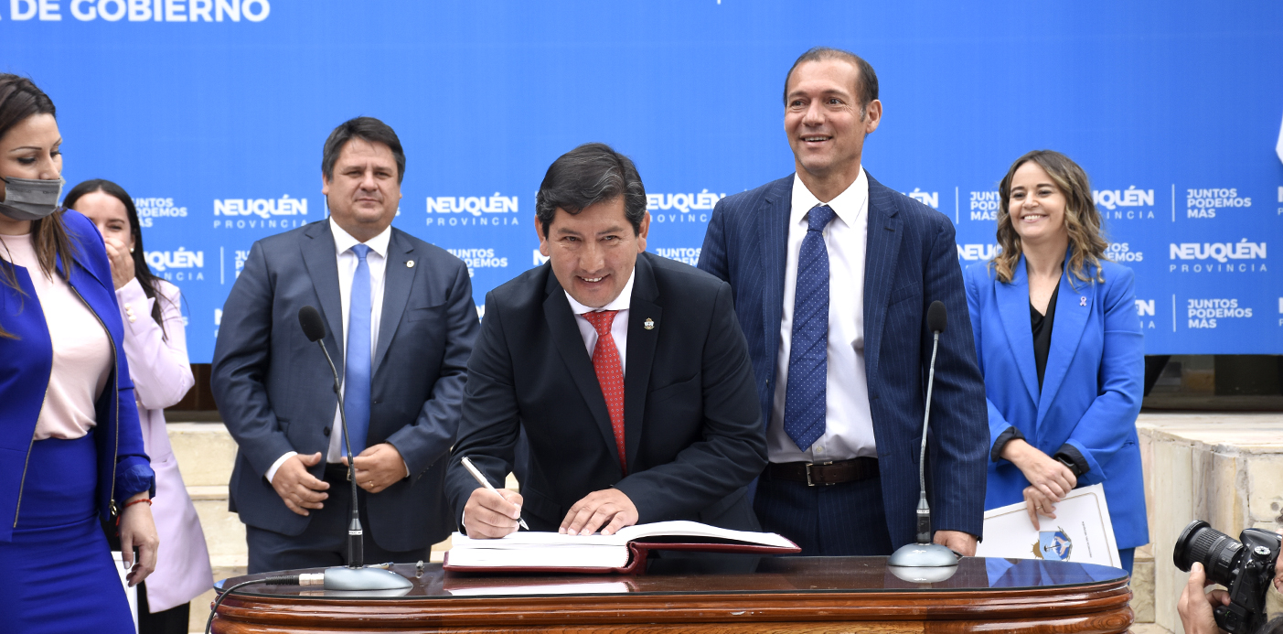 Con la toma de juramento que se realizó esta mañana, en Casa de Gobierno, el gobernador Omar Gutiérrez puso en funciones a los nuevos ministros y ministras de su Gabinete y les agradeció a sus antecesores, algunos de los cuales pasaron a desempeñar otras funciones. En virtud de los objetivos de gobierno se crearon nuevos ministerios, pero no se modificó la cantidad total, debido a que se realizaron fusiones. Los nuevos ministros son los siguientes: Osvaldo Llancafilo (Gobierno y Educación), Sandro Badilla (Turismo), Abel Di Luca (Desarrollo Social y Trabajo), María Eugenia Ferraresso (De las Mujeres y de la Diversidad) y Alejandra Piedecasas (de Deporte). Tienen nuevo organigrama los ministerios de Seguridad, que quedó a cargo de la ministra Vanina Merlo y De Niñez, Adolescencia, Juventud y Ciudadanía, que continúa bajo la conducción de la ministra Sofía Sanucci Giménez. Durante el acto, el gobernador les agradeció a los ex ministros y ministras y definió a Cristina Storioni (ex ministra de Educación) y a Marisa Focarazzo (ex ministra de Turismo) como “dos leonas, dos mujeres que con la misma actitud que gobernaron y construyeron políticas públicas, van a salir adelante”. Ambas renunciaron por estrictas razones de Salud y Storioni envió una sentida carta que fue leída -en la apertura del acto- por la ex diputada provincial Gloria Sifuentes. Focarazzo continuará en la conducción del ente oficial de promoción turística, NeuquénTur. “No hubo ni un lapsus de egoísmo” en ellas, señaló el gobernador y agregó: “Pensaron en la gente, las dos me vinieron a ver y me dijeron ´hasta acá Omar´; han hecho una tarea muy importante y nosotros asumimos la responsabilidad de que esa siembra no caiga en saco roto También seguirá ligado a la gestión de Gutiérrez el ex ministro de Ciudadanía, Ricardo Corradi Diez, quien “ahora pasará a desempeñarse en la visibilización de cuestiones vinculadas al quehacer político”. Corradi trabajará muy cerca del gobernador, quien también tuvo palabras de reconocimiento hacia la ex ministra Adriana Figueroa (Desarrollo Social) y el ex ministro Luis Sánchez (Deportes). “Han cumplido con el objetivo que hemos planteado”, señaló entre otras cosas el gobernador. “Hoy damos vuelta la página, encaramos una nueva etapa en la cual el brazo político del gobierno tiene la responsabilidad de demostrar, con coherencia en los hechos, el compromiso para construir, administrar, fortalecer y defender al pueblo” de la provincia, dijo Gutiérrez y apuntó que parte de los esfuerzos estarán destinados a profundizar la recuperación tras la pandemia. “Sobre la base de la confianza de levantar la bandera de la esperanza” se extremarán acciones en para recuperar “hasta el último puesto de trabajo y levantar hasta la última persiana de cada comercio, industria y actividad económica”, sostuvo. También este viernes asumieron Adrián Urrutia como subsecretario de Diversidad y Tomás Martínez como subsecretario de Articulación Social. Además, se publicó hoy en el Boletín Oficial de la Provincia el decreto por el que Ruth Alejandra Flutsch fue designada presidenta del Consejo Provincial de Educación (CPE). Flutsch era la vicepresidenta del CPE; mientras que los nuevos ministros desempeñaban los siguientes cargos: Llancafilo era secretario del Interior y Gobiernos Locales de la Provincia, Ferraresso era secretaria de Cámara de la Legislatura neuquina, Badilla era intendente de Villa Pehuenia Moquehue, Di Luca era subsecretario de Desarrollo Social y Piedecasas había sido subsecretaria de Salud. El gobernador también destacó el protagonismo de las mujeres (a cuya área de gobierno le asignó mayor jerarquía); se refirió al esfuerzo en la lucha contra el Covid-19 (el programa de vacunación neuquino se ubica entre los más eficientes y eficaces del país); y, por otro lado, anunció que este 10 de diciembre estará en Rincón de los Sauces, para participar del acto de asunción del nuevo secretario general del Sindicato de Petróleo y Gas Privado de Río Negro, Neuquén y La Pampa, en cuya conducción asumirá Marcelo Rucci. El gobernador señaló que desde la demagogia y la especulación “algún actor político que perdió las elecciones” (gremiales) ha intentado empañar el resultado; es por eso que llamó a respetar el veredicto de las urnas. Al acto, realizado en el patio de acceso al auditorio de Casa de Gobierno, asistieron el vicegobernador Marcos Koopmann, el intendente de la ciudad de Neuquén Mariano Gaido, jefes comunales de toda la provincia, legisladores, ediles, autoridades del Poder Judicial, el rector de la Universidad Nacional del Comahue Gustavo Crisafulli y el secretario general Guillermo Pereyra, entre otras autoridades
