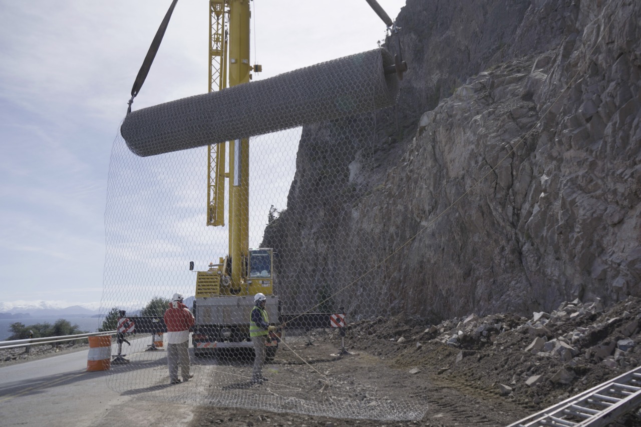 Luego de la finalización del saneamiento y limpieza de la ladera en Brazo Huemul, comenzó la colocación de los elementos de protección, en su primera etapa. Neuquén - El Ministerio de Transporte, a través de Vialidad Nacional, informa que la empresa Paramassi Andina, comenzó las tareas de protección de la ladera en la ruta 40, a la altura de Brazo Huemul (km 2094). Tras los trabajos de saneo (limpieza), que consistieron en el vuelco del material suelto que quedó disperso luego de las detonaciones, inició la colocación de las mallas de contención sobre la ladera. El trabajo consiste en el izamiento por medio de una grúa, a más de 70 metros, de rollos de mallas metálicas, que luego se despliegan desde la cima y hasta el pie del contra-talud y van asegurándose y copiando la forma de la ladera, con la intervención de escaladores profesionales. Se colocarán 20 paños de cuatro metros de ancho cada uno, que luego se unirán entre sí y serán finalmente asegurados a la ladera por medio de cables de acero. Estas mallas funcionarán como contención para que cualquier material que se desprenda no alcance la calzada, y quede retenido por las mismas. Durante el tiempo que duren las tareas, el tránsito permanecerá restringido a una calzada, asistido de una mano por vez, por la presencia de la grúa, maquinaria y operarios trabajando. Por ello, Vialidad Nacional solicita a los usuarios respetar las velocidades señaladas y las indicaciones del sector.
