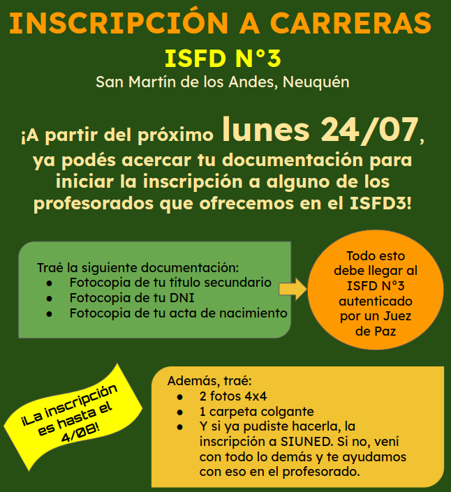 Además, cada ingresante deberá llenar su inscripción por SIUNED. Este trámite se puede hacer antes o después de llevar la documentación al ISFD N°3. En el caso de que los interesados necesiten ayuda con esto, podrán solicitarla en Secretaría o bien, podrán entrar a este enlace donde encontrarán las instrucciones para llevar adelante dicho trámite: https://youtu.be/dfY9SqEMOmQ