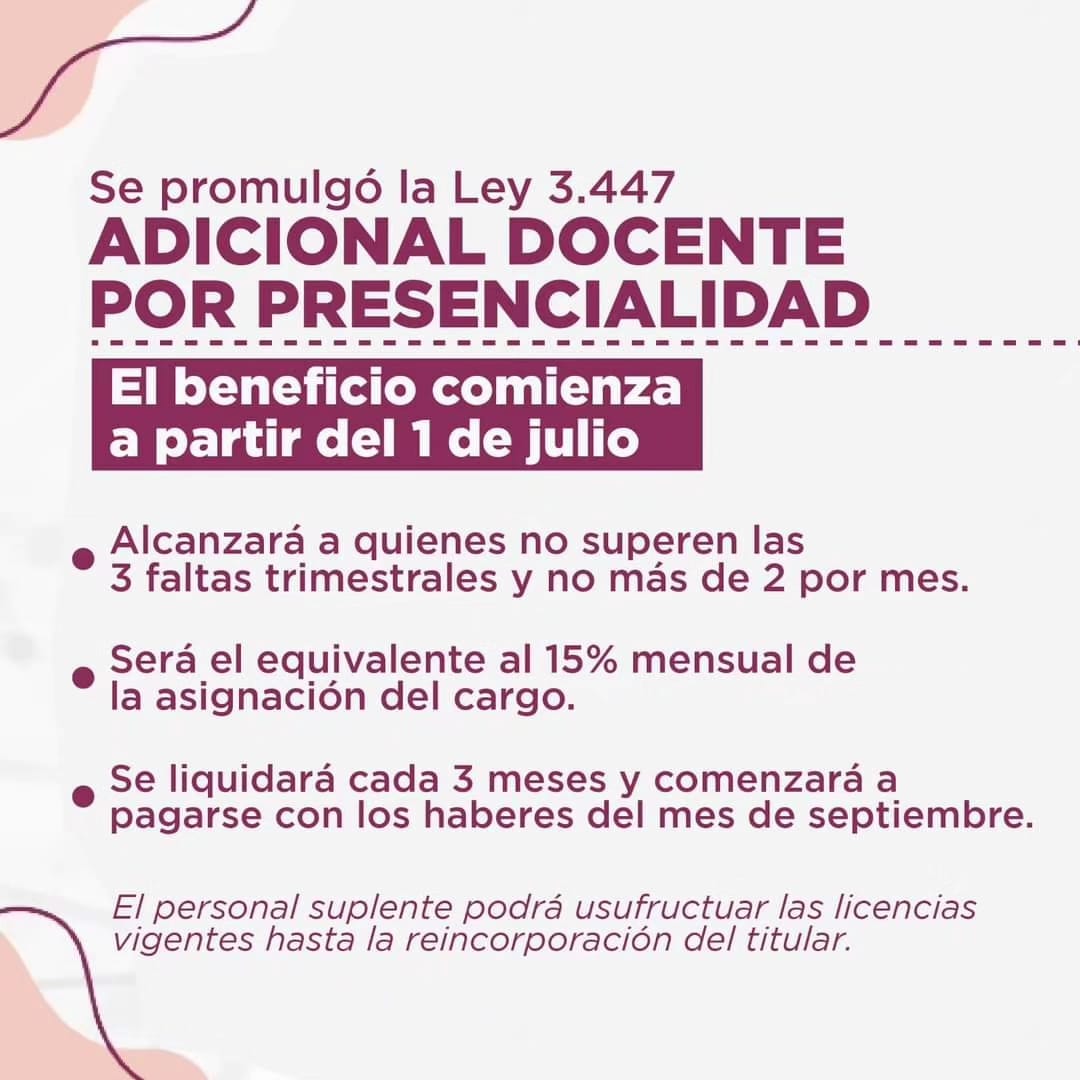 Fue promulgada, este viernes, la Ley Provincial Nº 3447 sancionada por esta Legislatura, y que creó el adicional docente remunerativo no bonificable, denominado Adicional al Desarrollo Profesional Docente. Entrará en vigencia este lunes, 1 de julio, el cálculo de presencialidad para el pago del primer adicional; que se percibirá con los haberes devengados del mes de septiembre del corriente año, considerando el trimestre inmediato anterior.