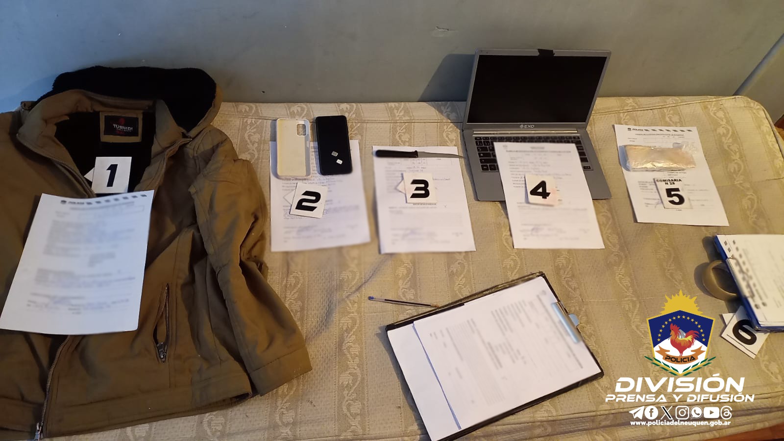 Personal de la División Brigada de Investigaciones de Comisaría 28º realizó ayer (21/08) un allanamiento, secuestrando celulares, equipos de informática, herramientas, prendas de vestir, un arma blanca, entre otros elementos de interés a la causa.La orden judicial permitió demorar a los autores del ilícito cometido.La tarea surgió el domingo 20 de agosto, cuando un hombre denunció en Sede Policial haber sido amenazado y golpeado por sujetos que conocía.El mismo, chofer de un automóvil taxi mencionó haber sido solicitado por teléfono para el Barrio Puerto Manzano para realizar un viaje. En el lugar cinco personas se subieron al rodado, pero a la fuerza por lo que debió comenzar el trayecto y fue allí, que el damnificado resultó lesionado con elementos contundentes y amenazado con una presunta arma blanca,En cuanto a los pesquisas, se movieron rápidamente consignado el domicilio de los presuntos autores donde tres sujetos fueron aprehendidos en horas de la tarde. Siendo un mayor de edad y dos adolescentes.Horas más tarde la justicia autorizó un allanamiento hallando teléfonos celulares, un arma blanca, equipos de informática, dinero en efectivo en moneda nacional, un cartucho calibre 22 m.m, y herramientas varias.Luego y pasada las 16:00, se presentó en la guardia de Comisaría 28º, un sujeto mayor de edad consultando la situación judicial de los jóvenes, pero al guardar vinculo con la tarea investigada, fue aprehendido y demorado.Posteriormente, los investigadores dieron con la ubicación de otro hombre en la Terminal de Ómnibus local, vinculado también al ilícito cometido. Fue demorado y trasladado a Sede Policial.Como consecuencia, los jóvenes fueron puestos a disposición de Desarrollo Social Municipal. En cuanto a los sujetos mayores de edad, esperan actuaciones por parte de la justicia.
