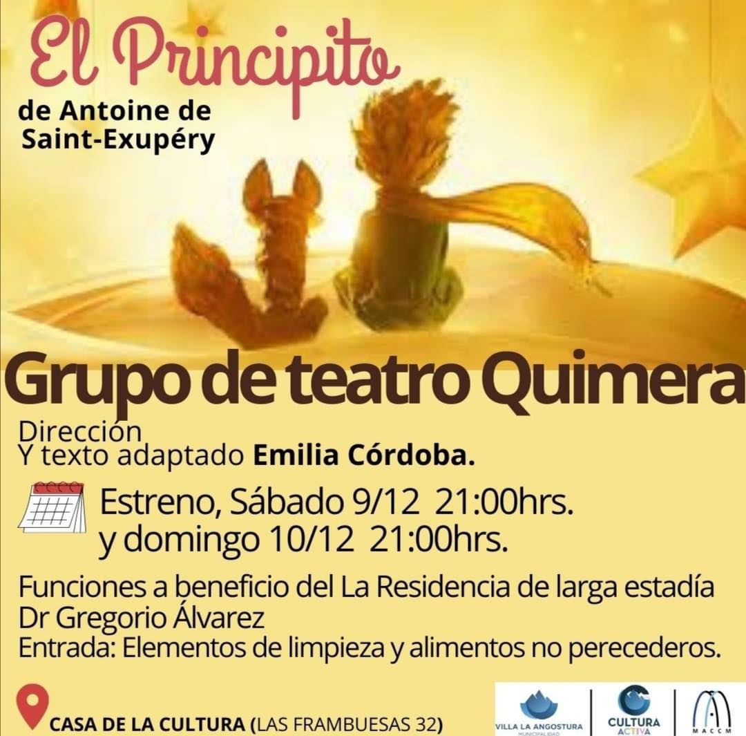 Este fin de semana, el Grupo de Teatro Quimera presenta la conmovedora obra teatral "El Principito" de Antoine de Saint-Exupéry. Las funciones se llevarán a cabo el sábado 9 y domingo 10 de diciembre a las 21 horas en la Casa de la Cultura, ubicada en Las Frambuesas 32.